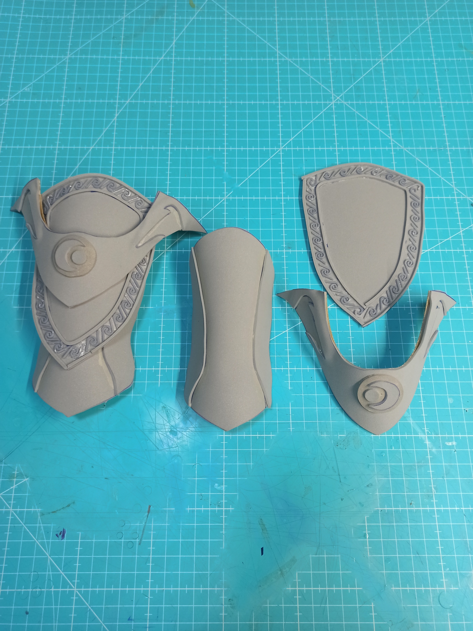 Los adornos salientes de la parte superior de las perneras est谩n hechos con PVC espumado para que se mantengan r铆gidos en su posici贸n. Para el relieve del interior, un铆 las piezas de goma eva de 5mm cortadas en 谩ngulo para que quedasen las aristas m谩s salientes.