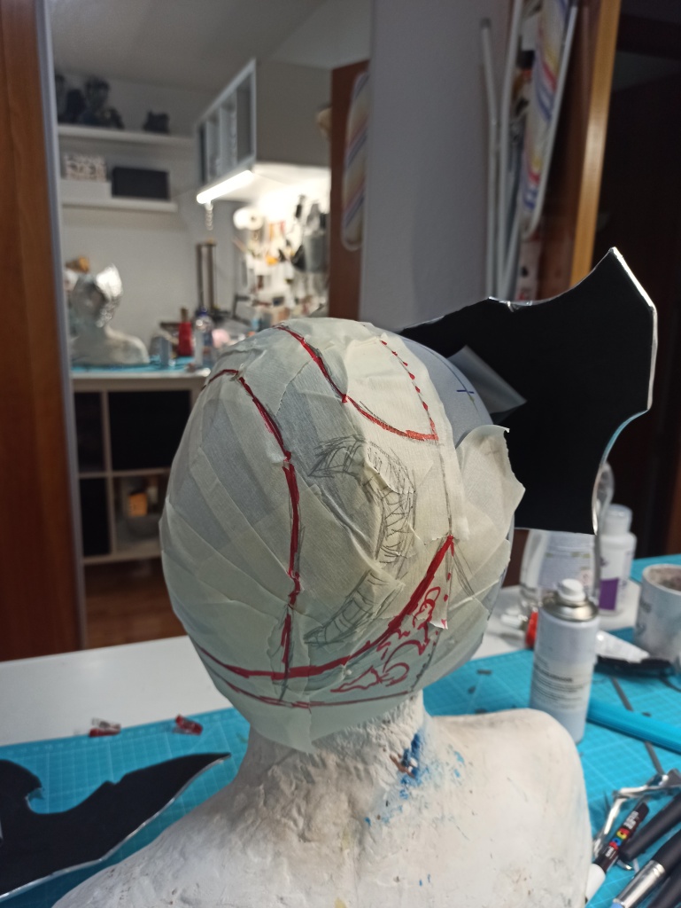 De igual manera hice los salientes laterales del casco, que fui dibujando aproximadamente en papel y coloqué sobre mi cabeza de escayola. Probando, probando, cambiando aquí y allí fui haciendo modificaciones a un trozo de cartulina hasta que me salieron como quería.