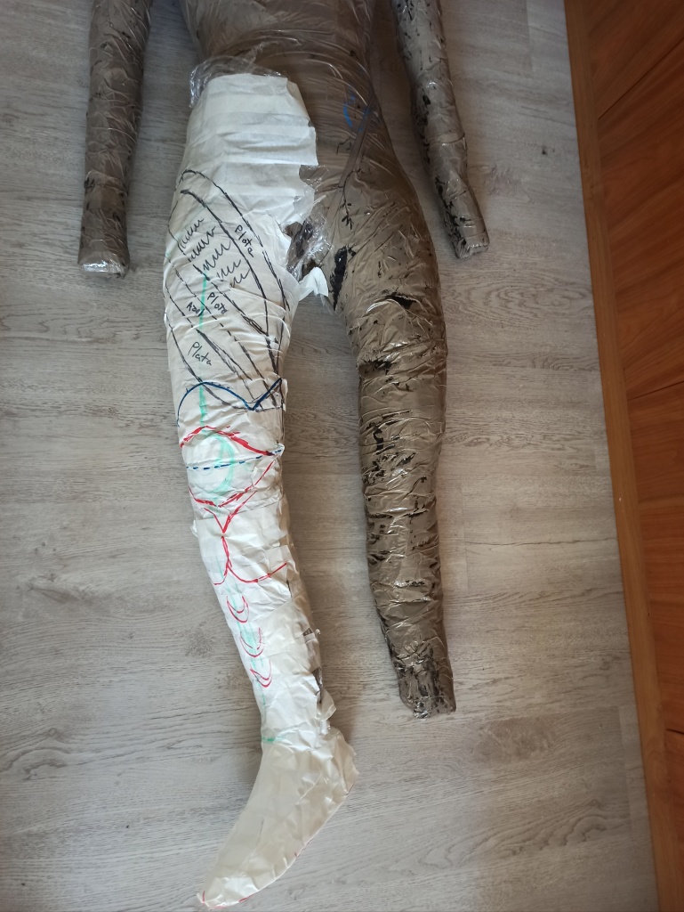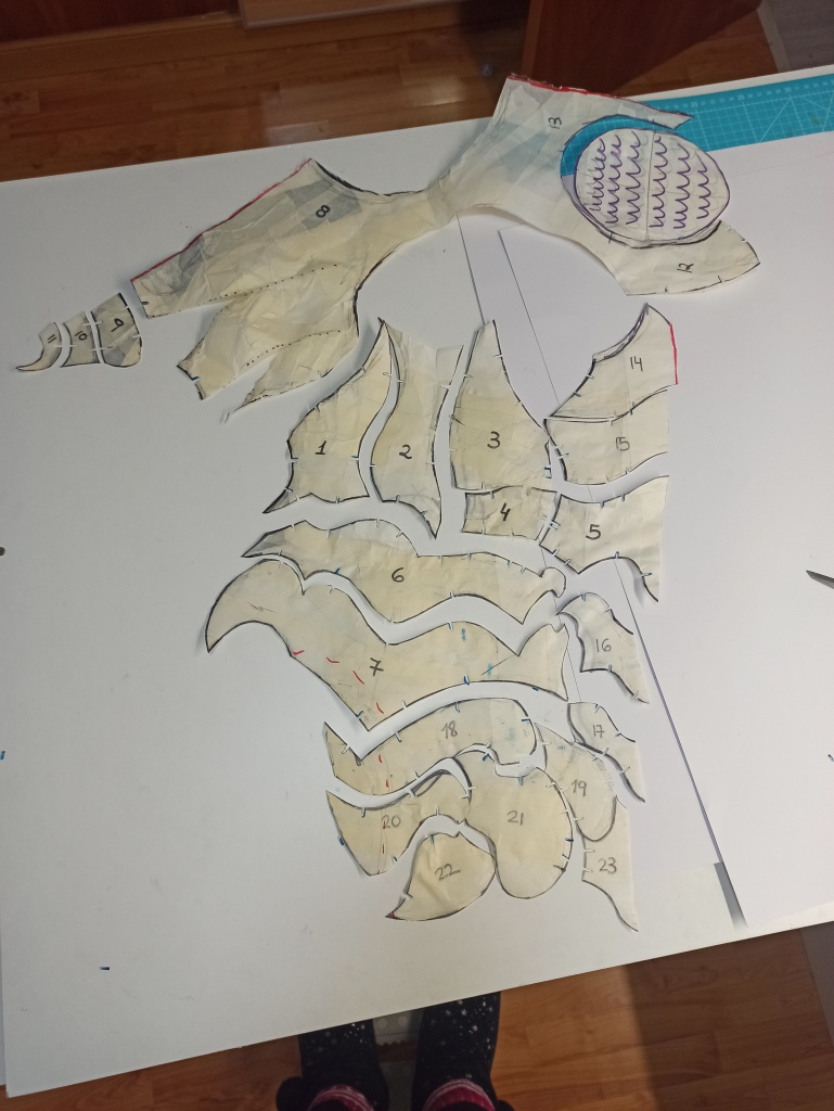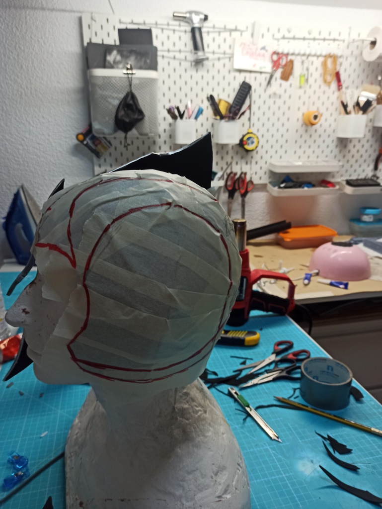 Para realizar el patronaje, empleé la técnica de envolverme en cinta aislante. Bueno, a mí no, a mi maniquí (hecho a medida con la misma técnica, por lo que esto es un poco “cintaception”) y dibujé los contornos de la armadura en el cascarón resultante.