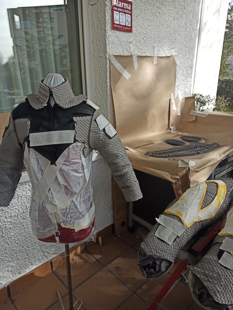 La cota de escamas también está hecha con goma eva. Realicé un diseño con Photoshop y lo mandé al plotter. ¡No sé cuantísimas tiras de escamas hice! La uní entre si con super glue y al mono con pegamento de contacto. No estoy del todo satisfecha con este elemento porque, aunque visualmente queda muy resultona, a efectos prácticos es bastante rígida y me limita el movimiento más de lo que me gustaría. Seguramente, seguiré probando con otros materiales y técnicas hasta que dé con algo que me permita más movilidad.