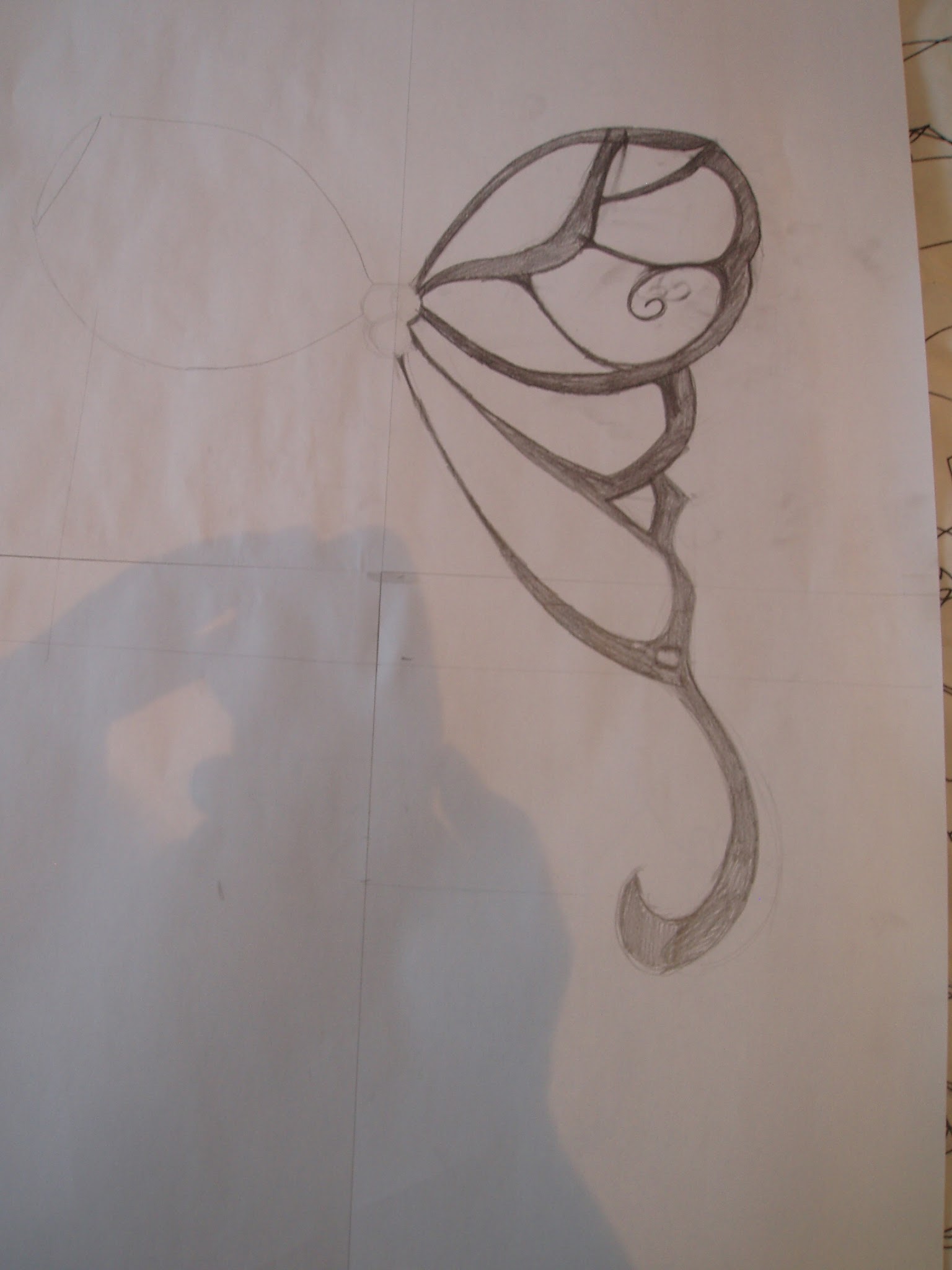 Lo primero que hice fue pintar la silueta del sujetador que iba a ir debajo en una cartulina grande. Y, a partir de ah铆, empec茅 a hacer el dibujo de la mariposa teniendo en cuenta que la parte m谩s baja de las alas queda a la altura de las costillas flotantes m谩s o menos y que el adorno negro de los extremos llega hasta casi la cadera alta.