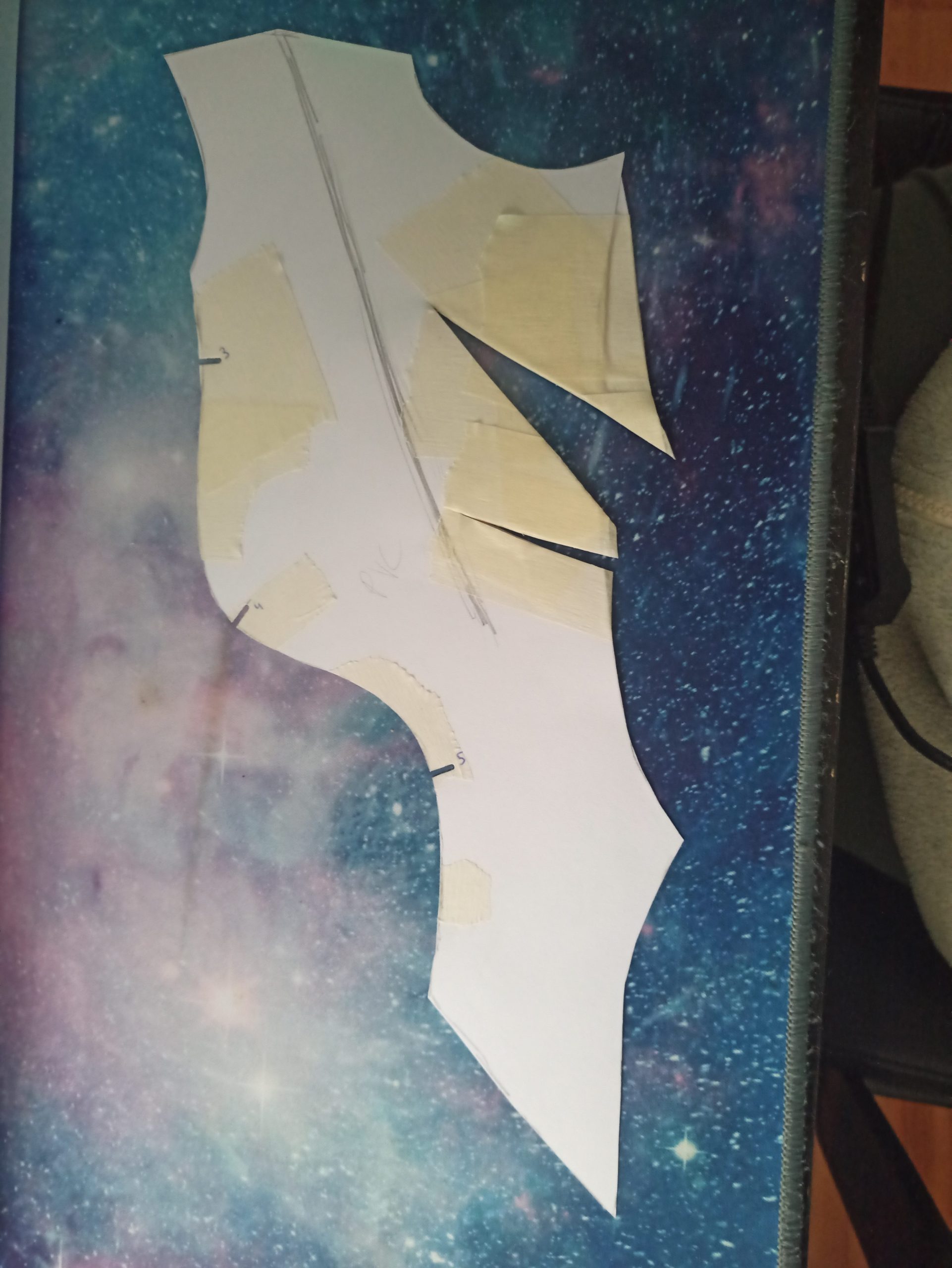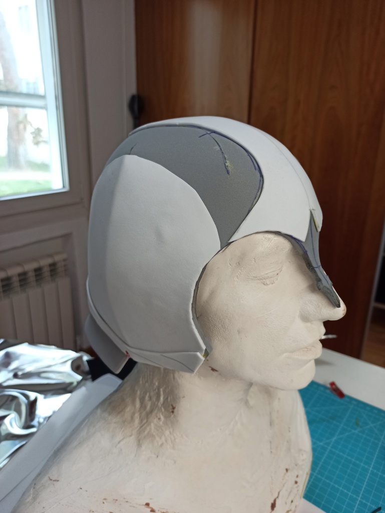 I wrapped my head replica with tape in order to make the helmet patterns. I used cardboard to pattern the sides.
