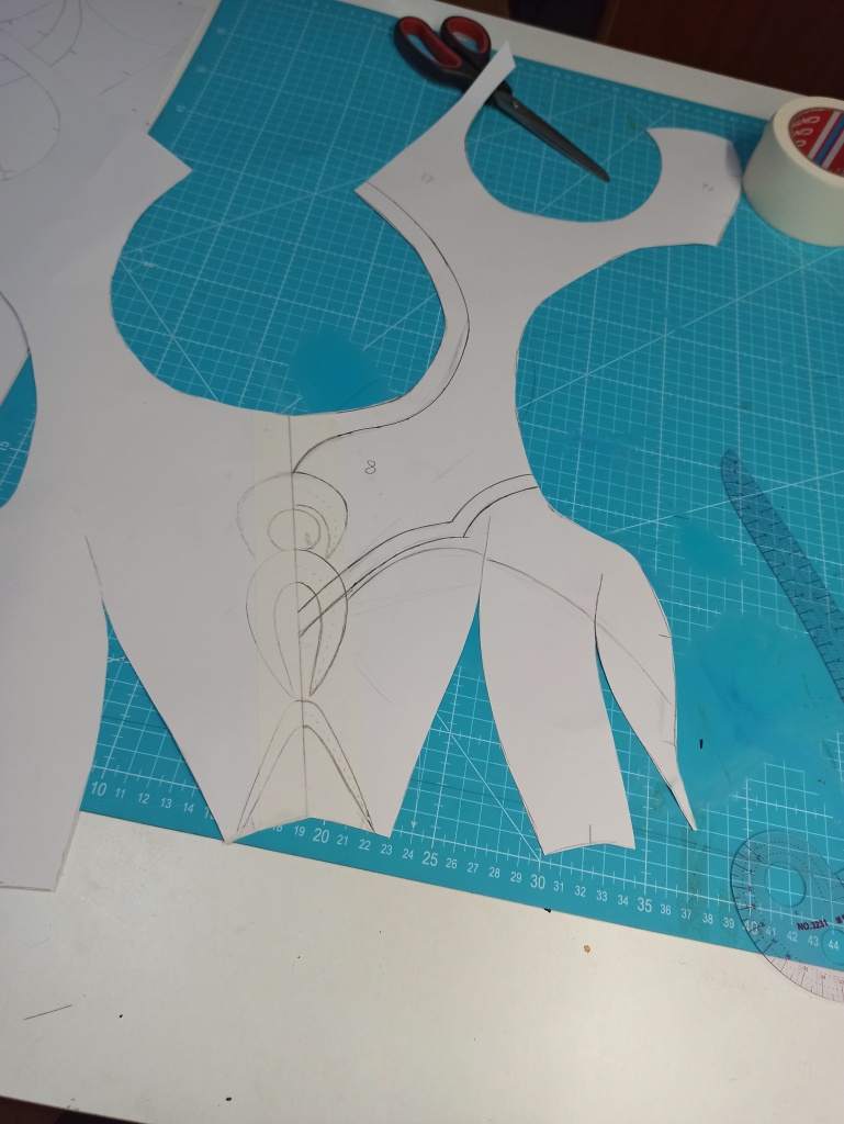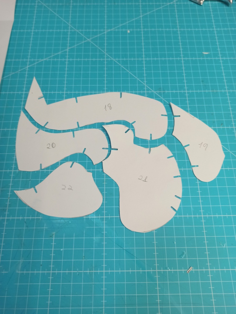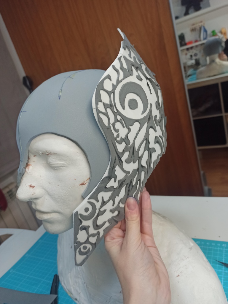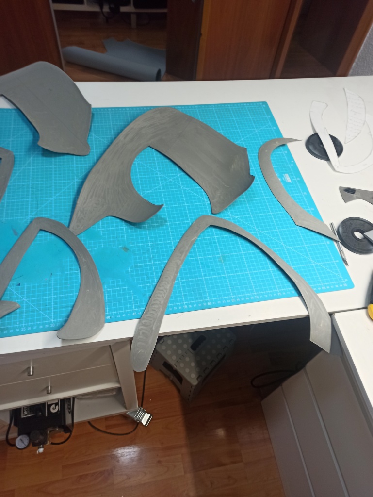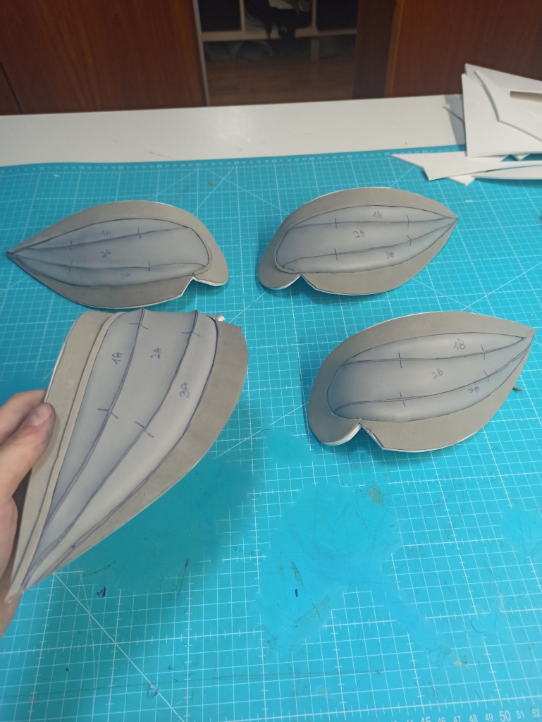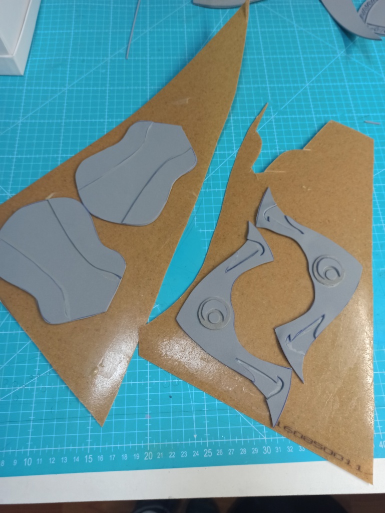 These pads were especially difficult to make as they have this intricate shape. In the original design you can see they’re made of several little pieces and that’s what I tried to emulate. With the base piece done, I added two layers of 2mm foam on top to smooth the volumes.