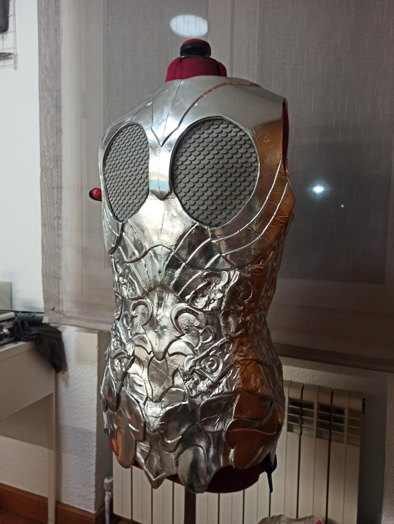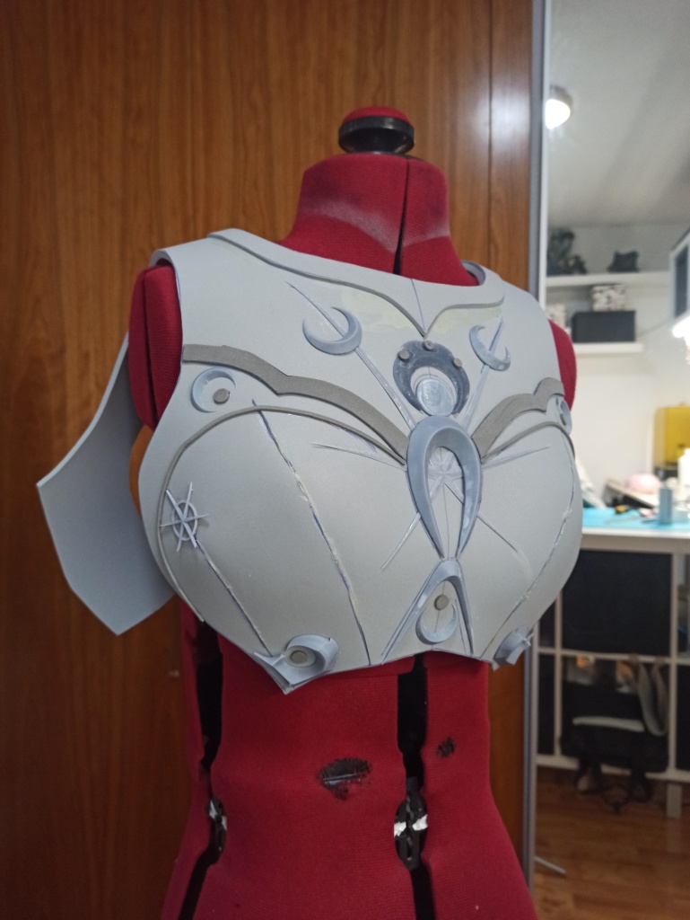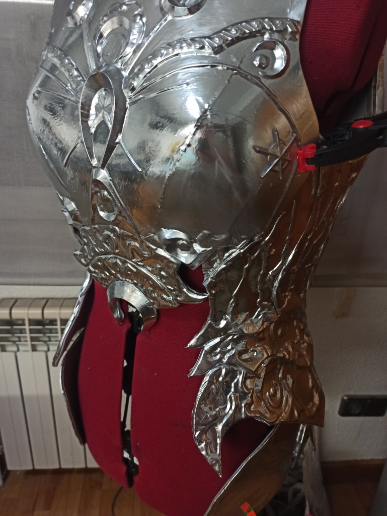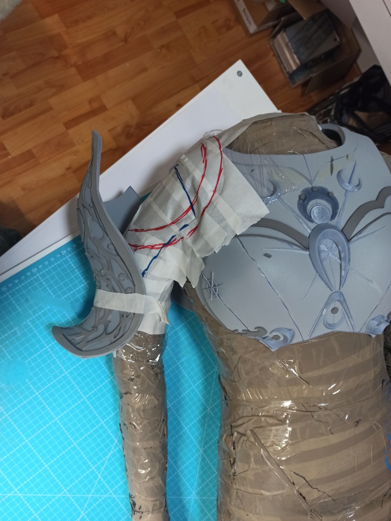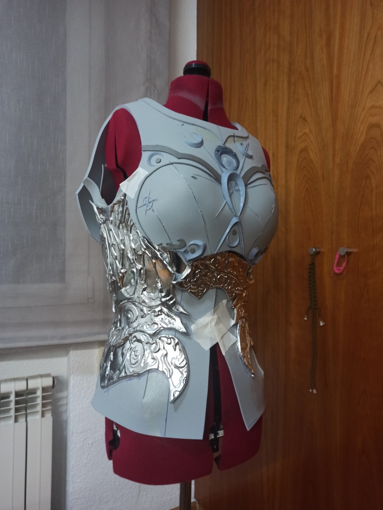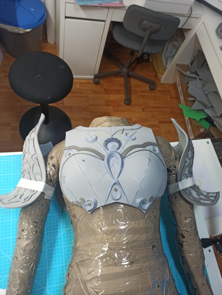 I first wrapped each piece in vinyl and then I glued everything together on the foam bodice. I personally like to make breastplates joined on the shoulders. I can do that because I have a very tiny head. It’s a personal obsession as I think this way armors look better.
