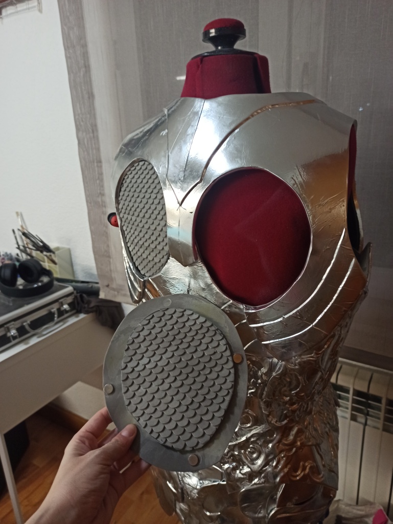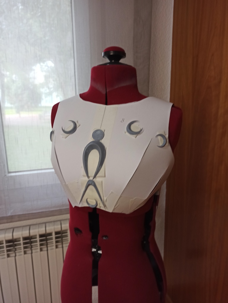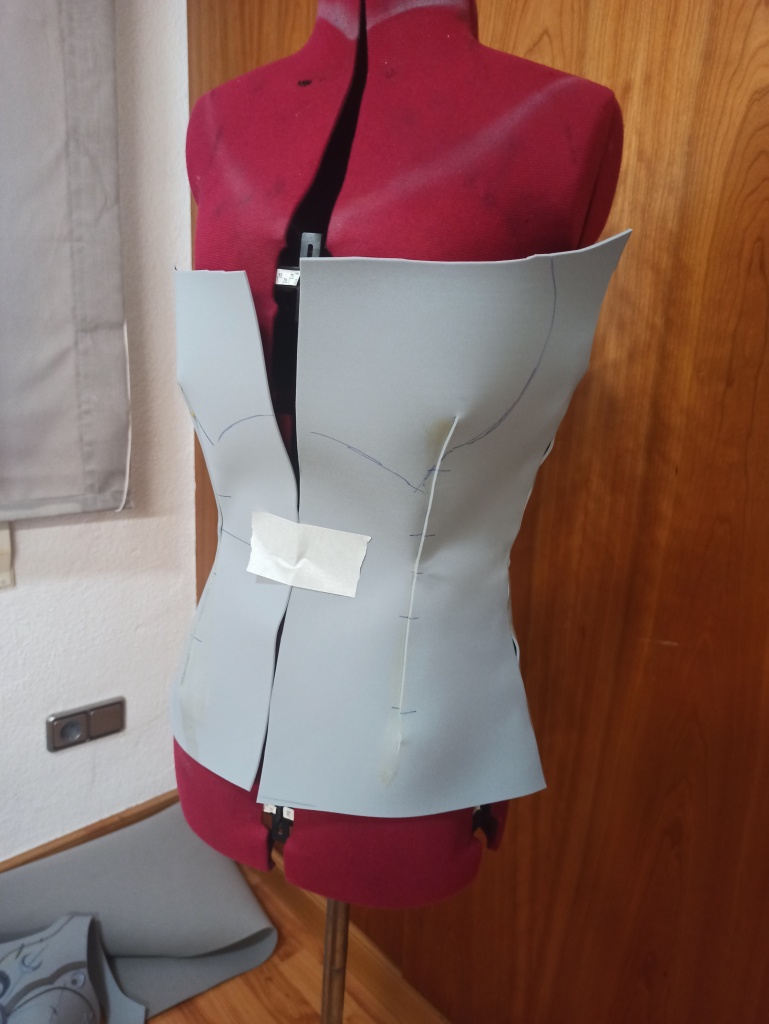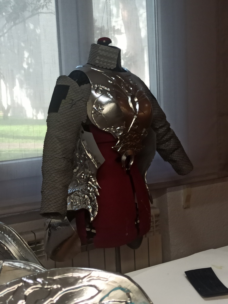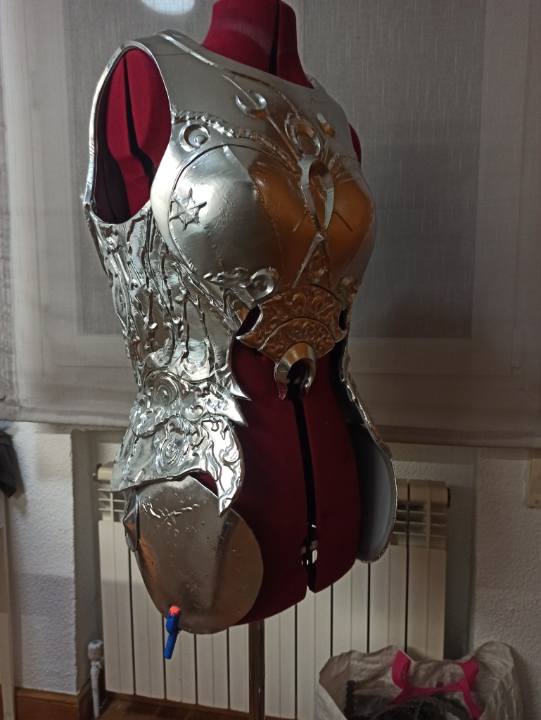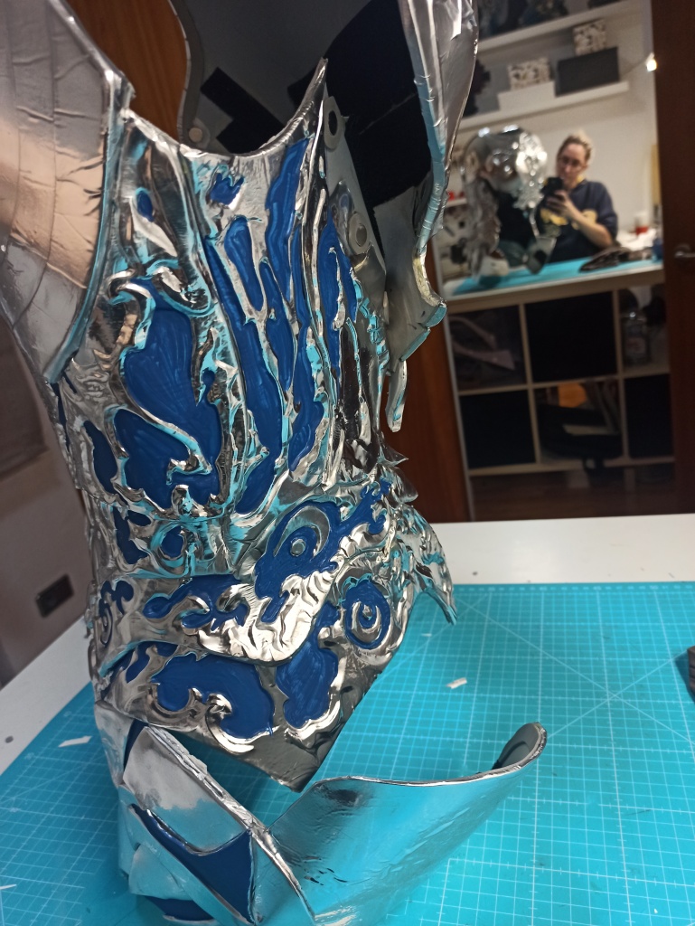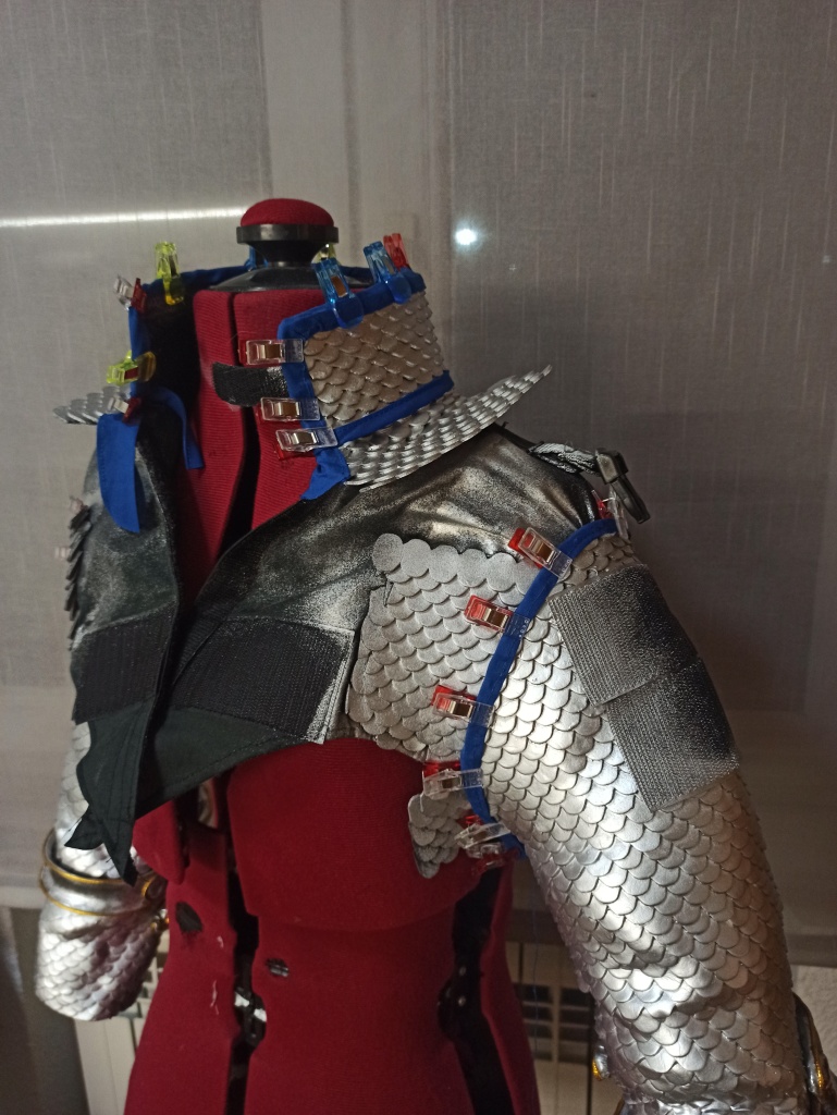 I first wrapped each piece in vinyl and then I glued everything together on the foam bodice. I personally like to make breastplates joined on the shoulders. I can do that because I have a very tiny head. It’s a personal obsession as I think this way armors look better.