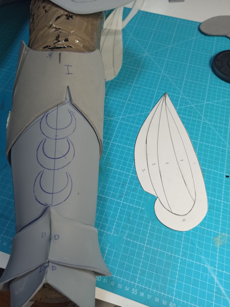 The upper prominent parts of the leg armor were made using PVC foam for stiffness. To make the relief between pieces, I cut in angle 5mm foam sheets and glued them together. This way the edges pop.