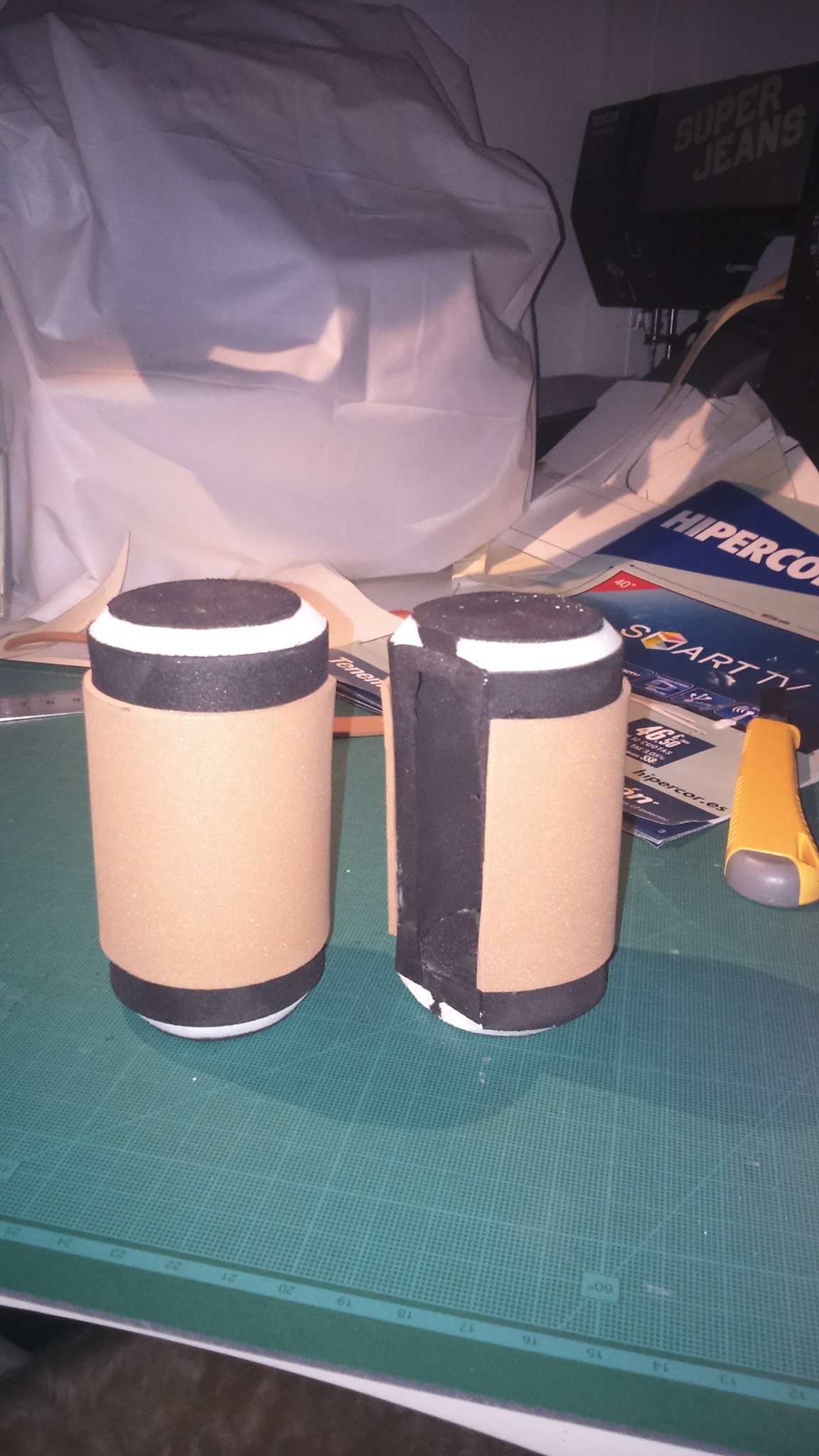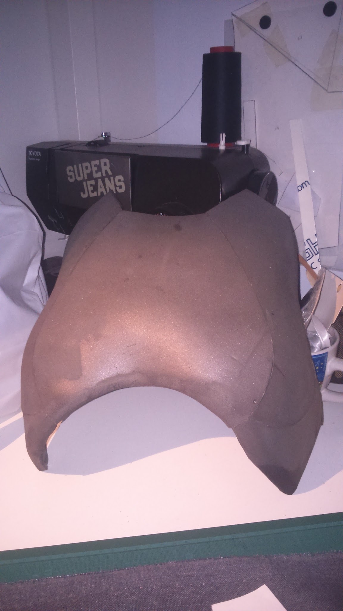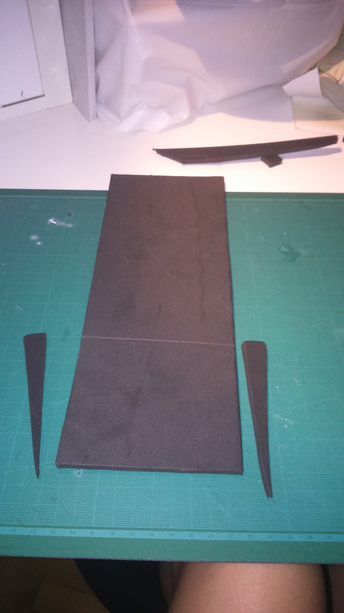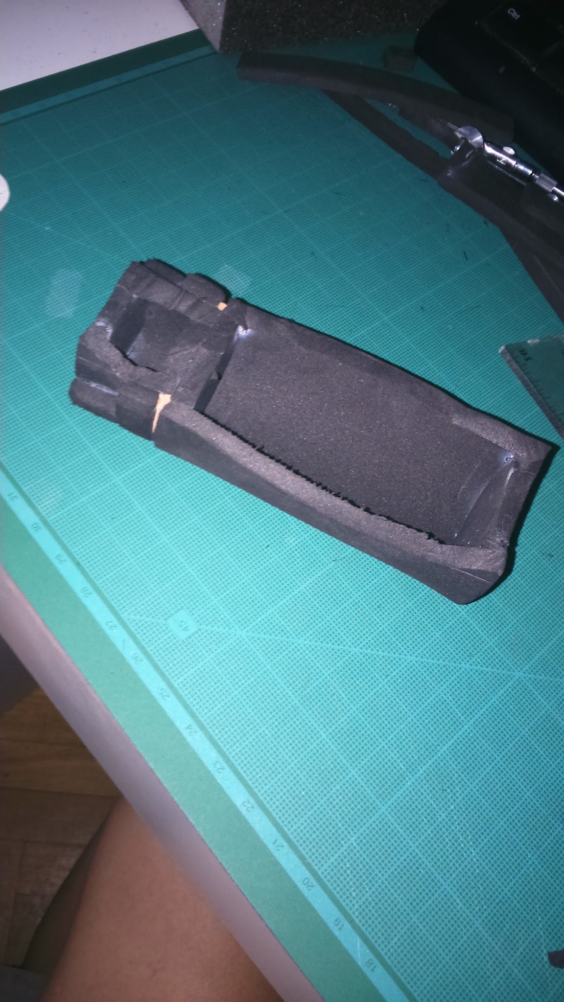 I have few pictures of the leg armor process, but it’s similar to the shoulder pad one. I used grooved craft foam for the upper parts and I used PVC foam for the thin protusion as this material is harder than foam.