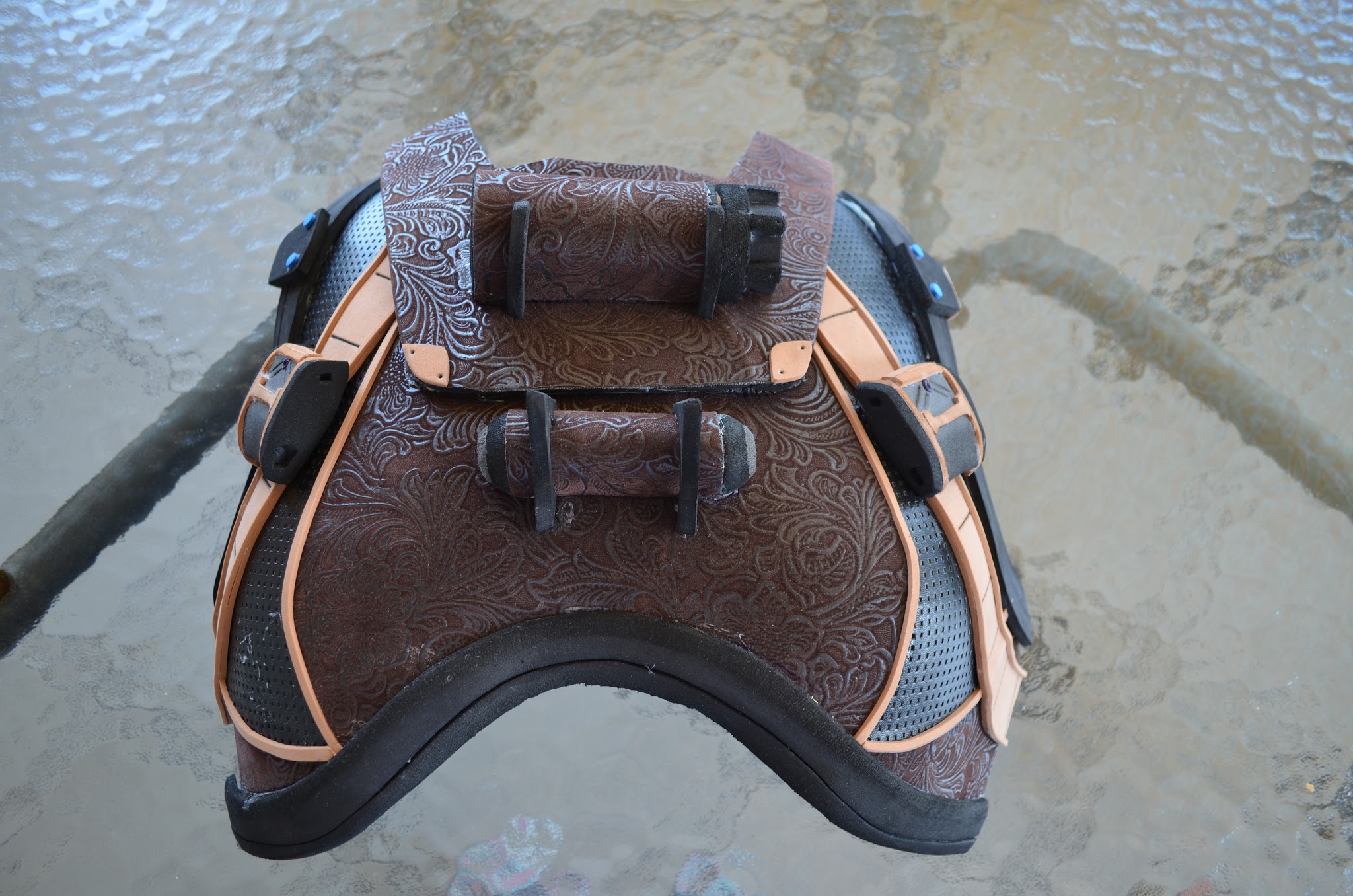 Before gluing the pieces together, I glued two textured fabrics on the armor surface. I bought a floral embossed vinyl and a holey faux leather. I glued the vinyl using contact cement and I used a thin layer of wood glue on the armor for the pleather to avoid the glue spilling trough its holes.