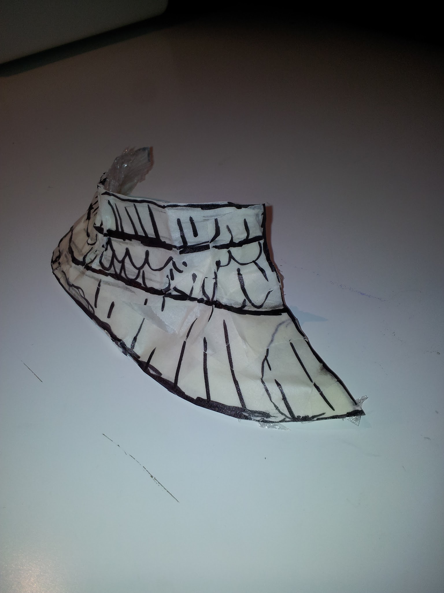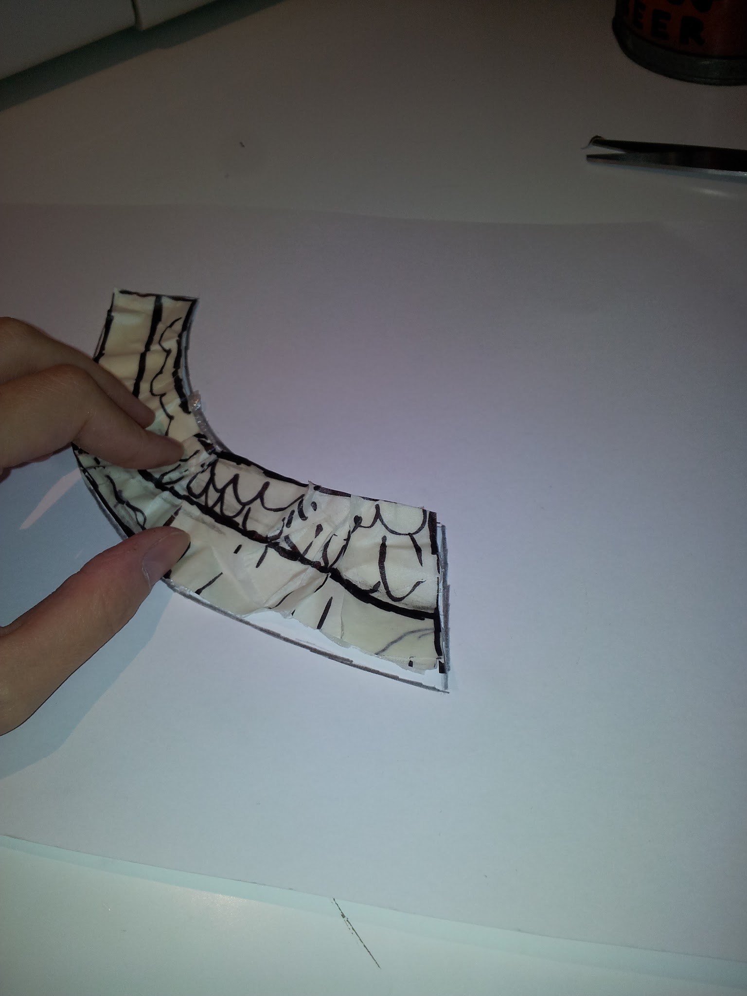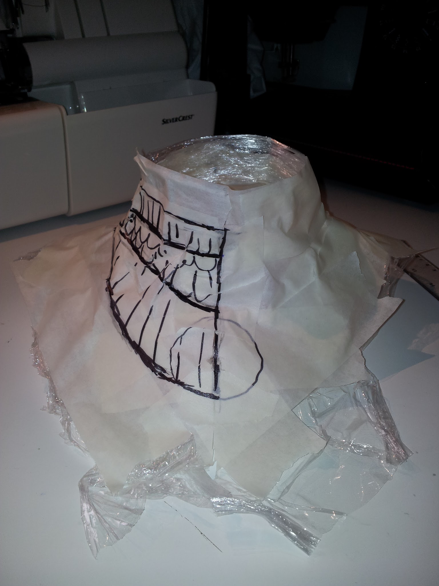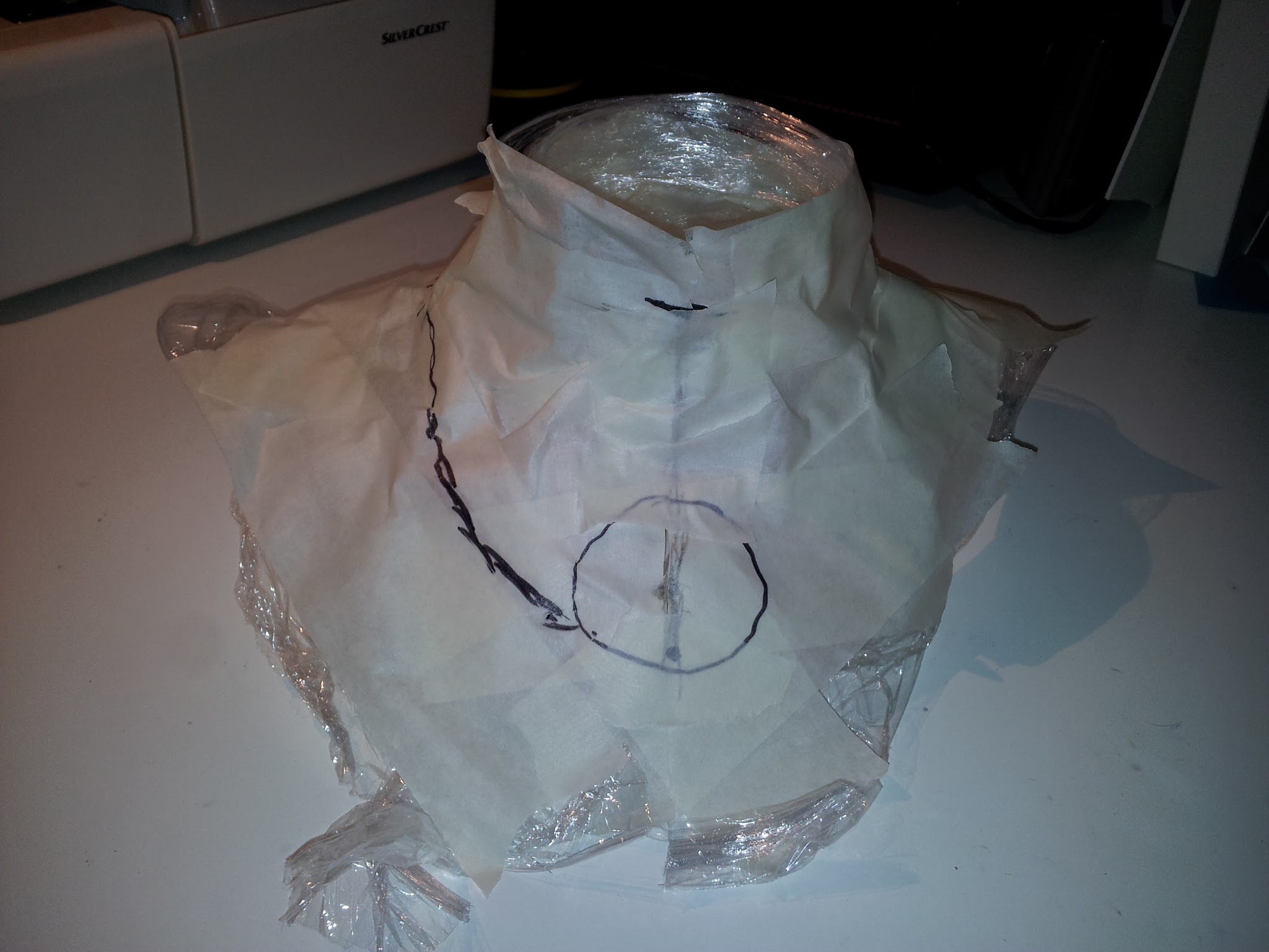 To make the pattern, I wrapped myself in plastic and masking tape to get a basic shape. I drew its shape with its details and I cut it out to obtain the pieces.