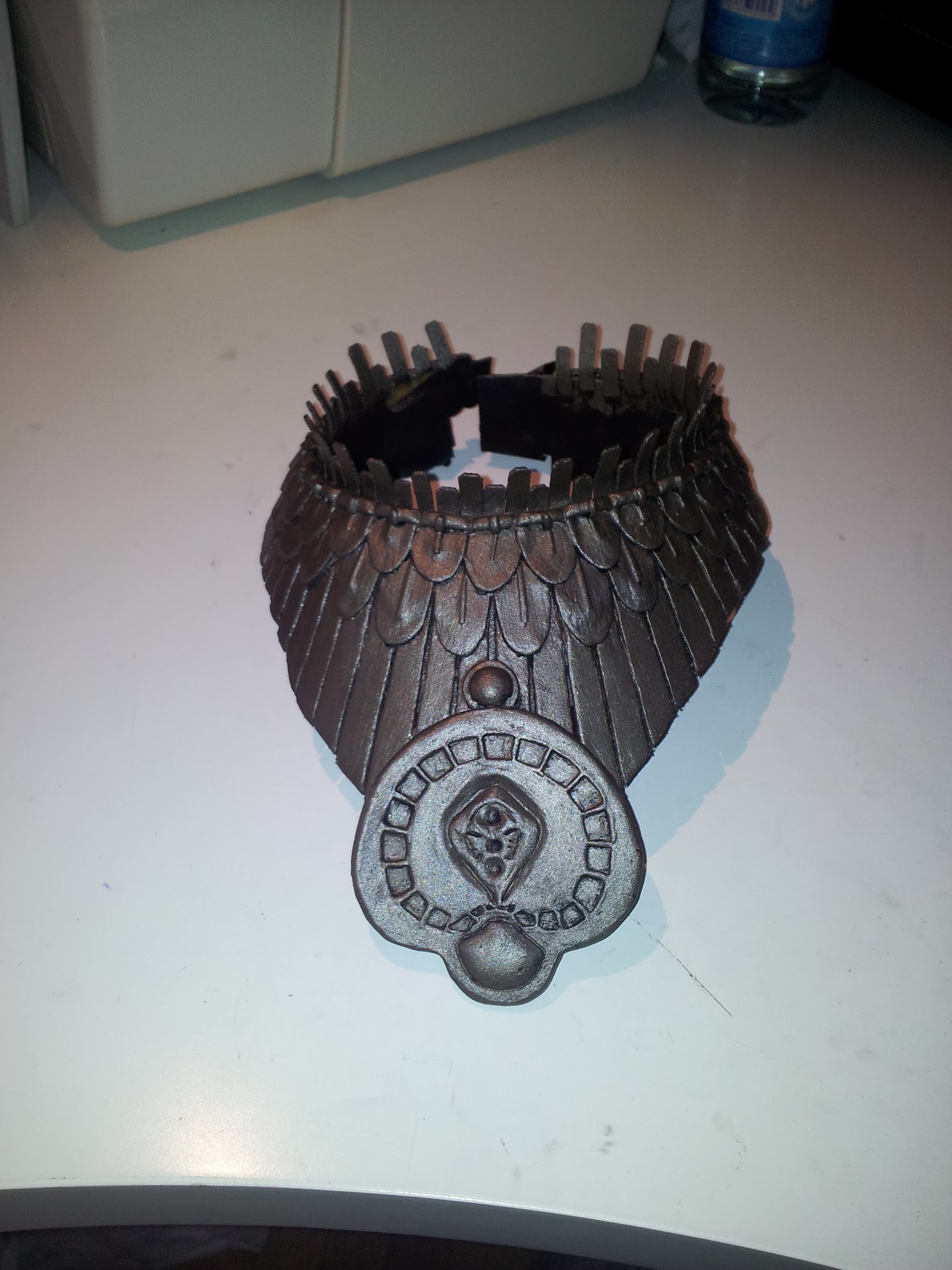 I primed the collar with a couple wood glue layers and priming spray. I hate priming Worbla as it’s got a terrible surface. I hate its texture. It needs a lot of work to smooth it out.