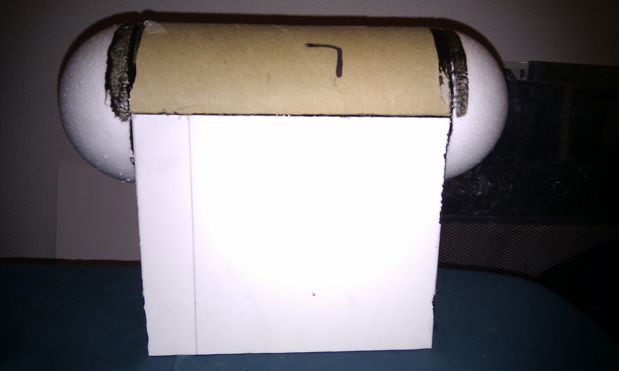 Luego Erikku-kun me dio un tubo de cart贸n y lo cort茅 por la mitad a lo largo para darle la forma redondeada superior. Y le a帽ad铆 dos semiesferas de corcho blanco en los extremos. Lo pegu茅 todo con termofusible.