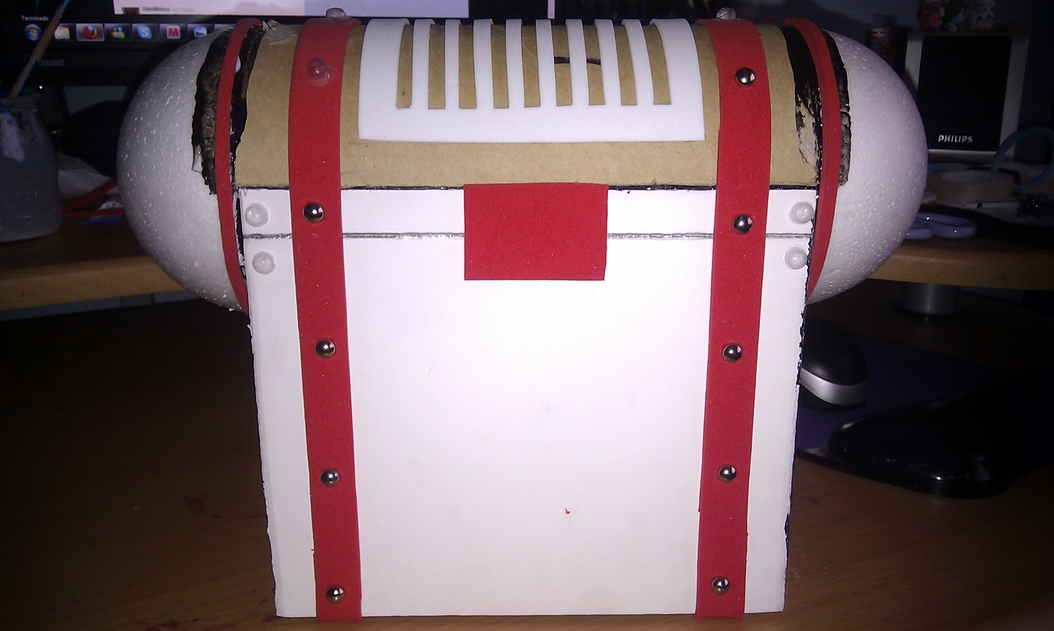Despu茅s fui a帽adiendo los detalles con recortes de goma eva de 2mm de grosor. Me puse a a帽adir tachuelas met谩licas y me qued茅 corta. As铆 que, en vez de eso, fui recortando los recept谩culos de un bl铆ster de p铆ldoras y los pegu茅 con superglue. Oye, dan el pego. Si os fij谩is unas son de metal y otras de pl谩stico transparente cutre. Lo cierto es que es una chorrada de la que estoy bastante orgullosa.