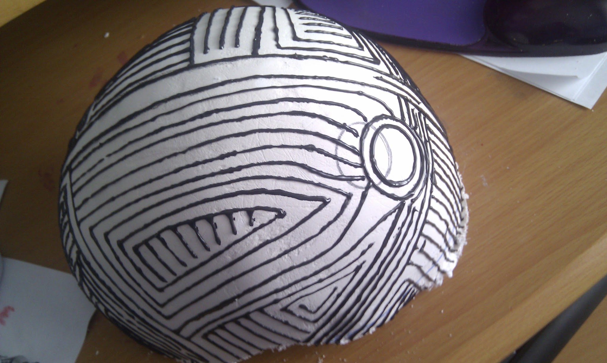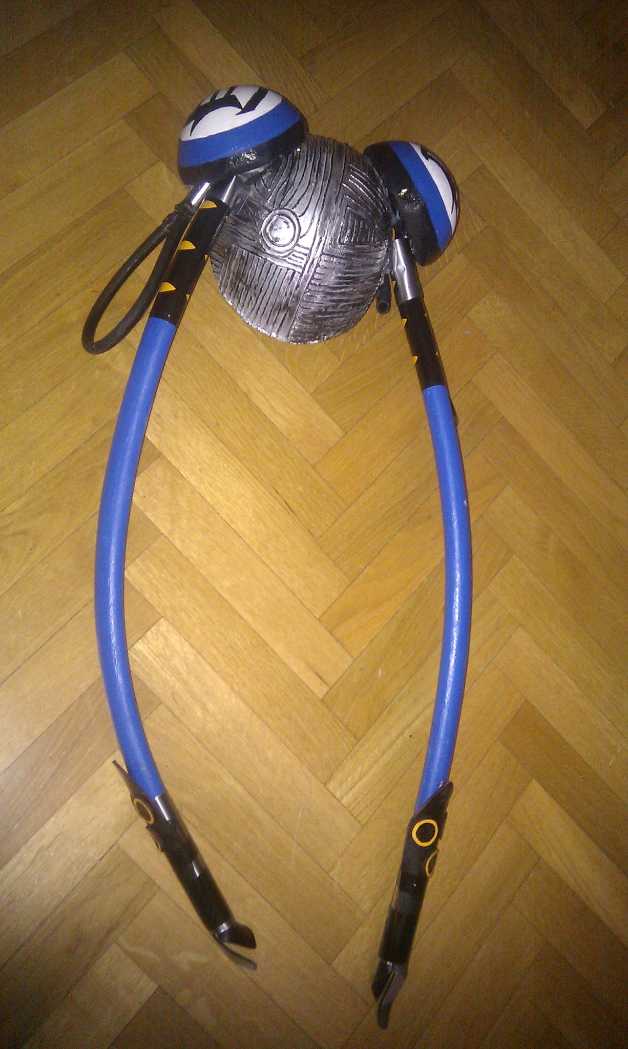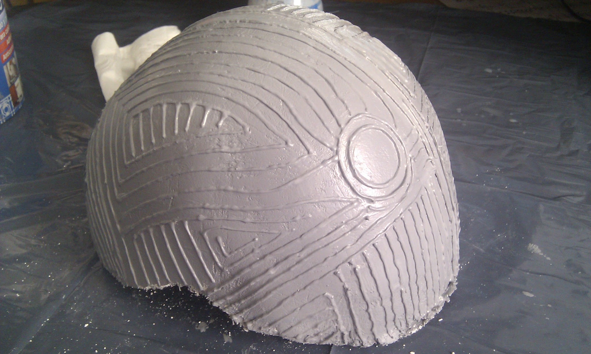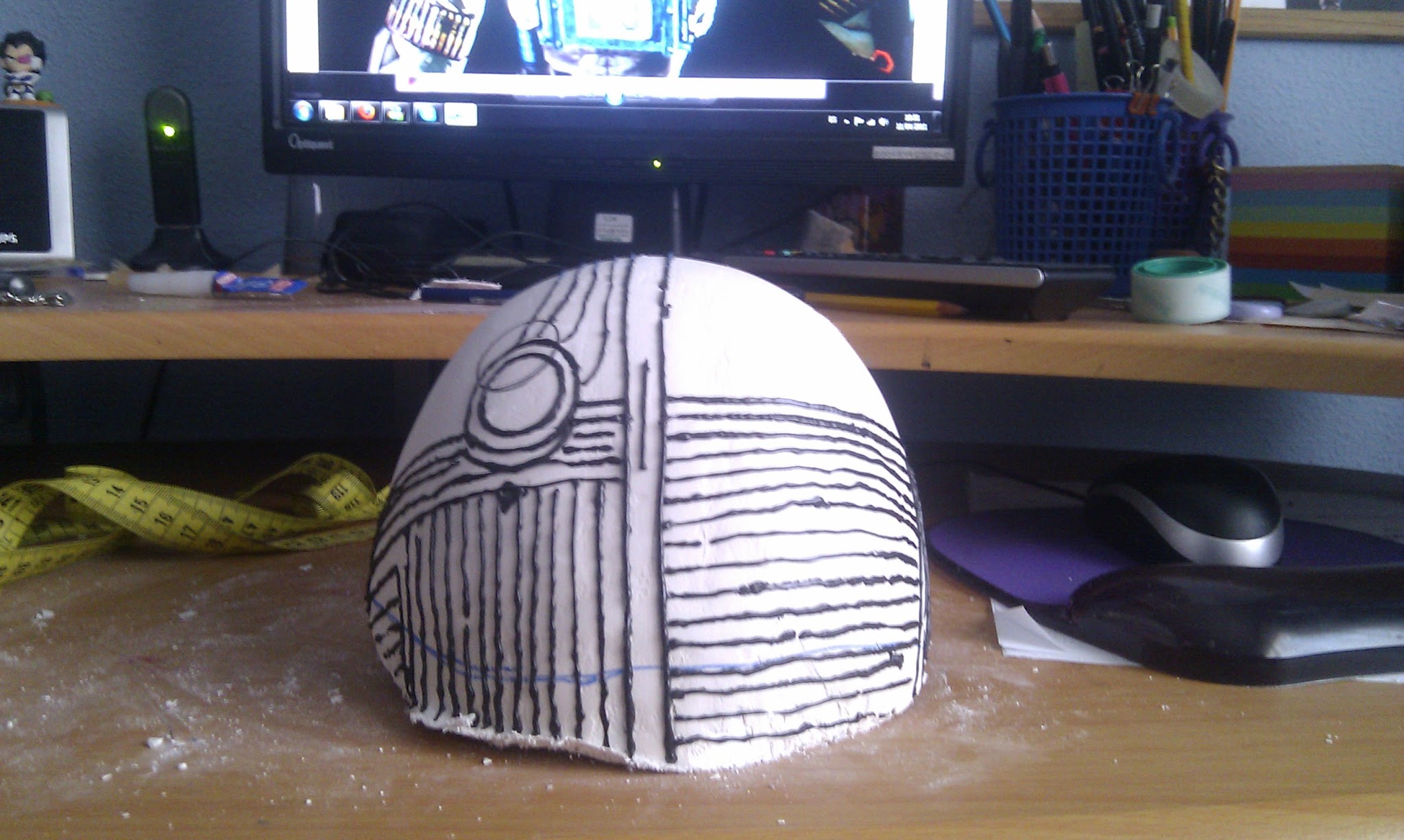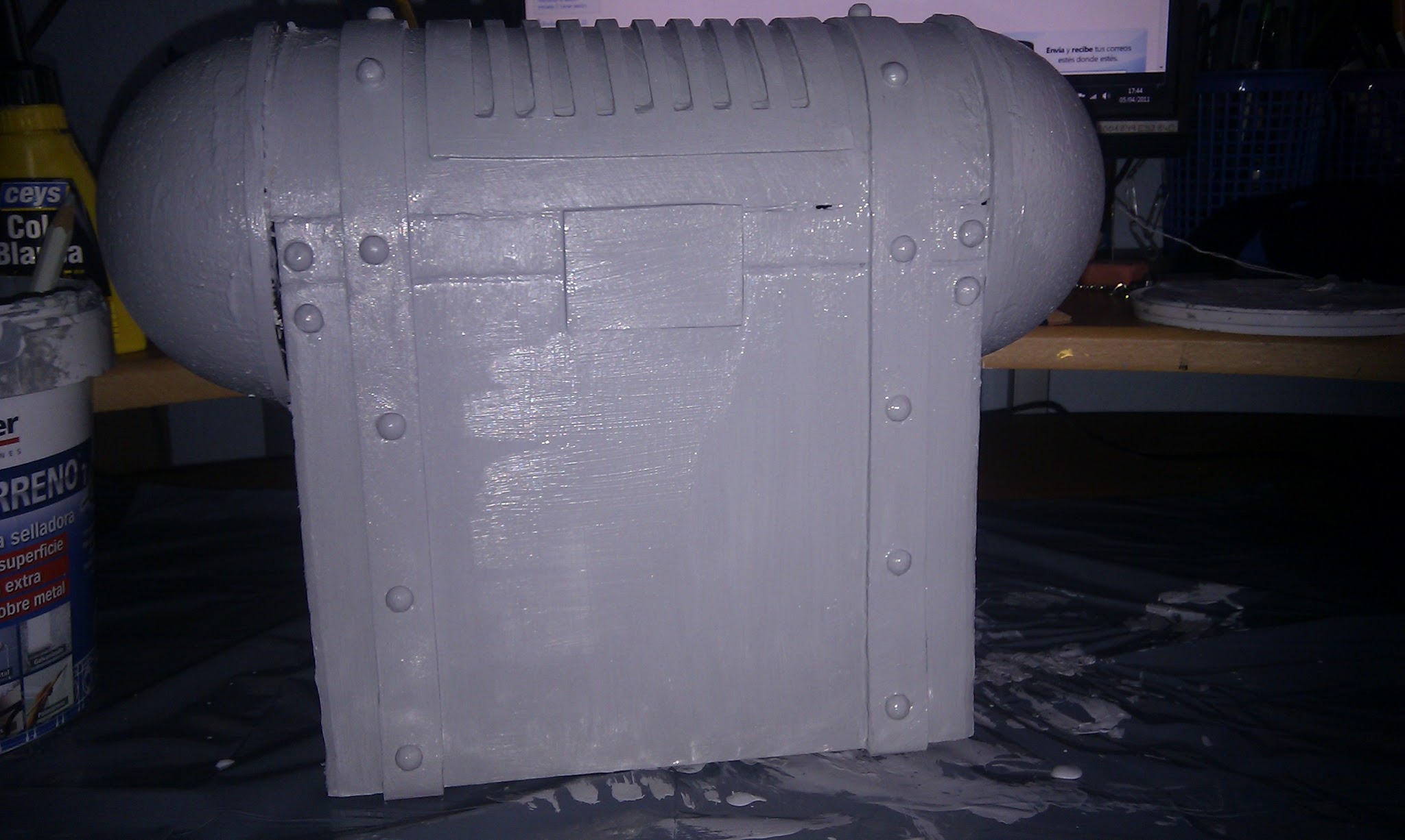 No tengo muchas m谩s fotos de esto aparte de esta 煤ltima en la que se ve c贸mo un铆 los tubos al casco. Aqu铆 se ve la primera vez que lo hice, que le puse agujeritos tanto a los tubos como al casco, para pasar a trav茅s de ellos un alambre. A los dos d铆as se rompi贸 (claro, la escayola no aguanta tanto y los tubos pesan y se mueven), as铆 que, entre l谩grimas y un mont贸n de tacos, lo arregl茅 colocando entre medias de la estructura unos trocitos de pl谩stico duro.