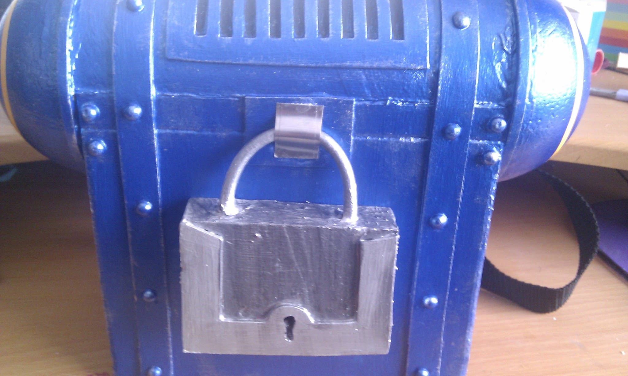 Para terminar, hice el candado, que es un trozo de styrofoam con relieves en goma eva, le puse las tiras naranjas a los lados, pint茅 las rendijas de negro para que parecieran m谩s profundas y le di un toque un poco desgastado con la t茅cnica de pincel seco y pintura plateada.