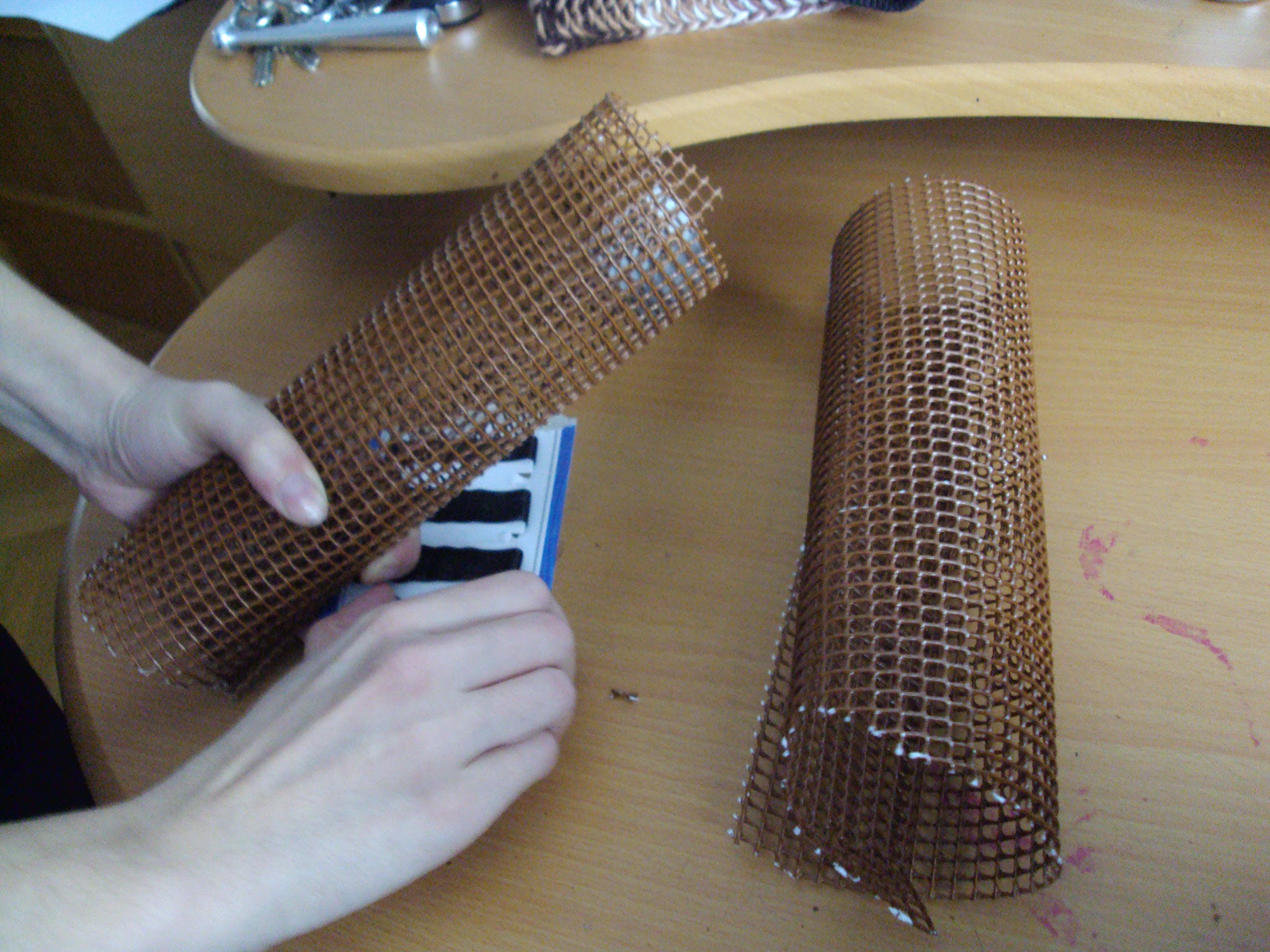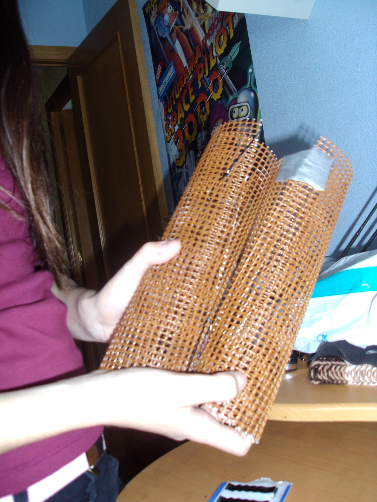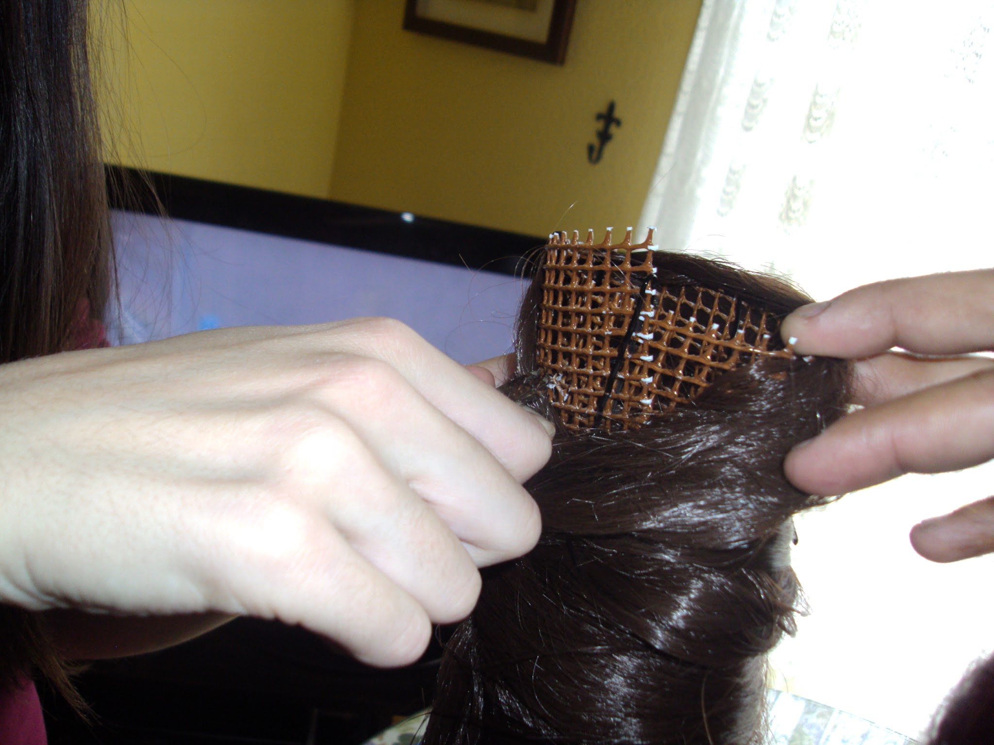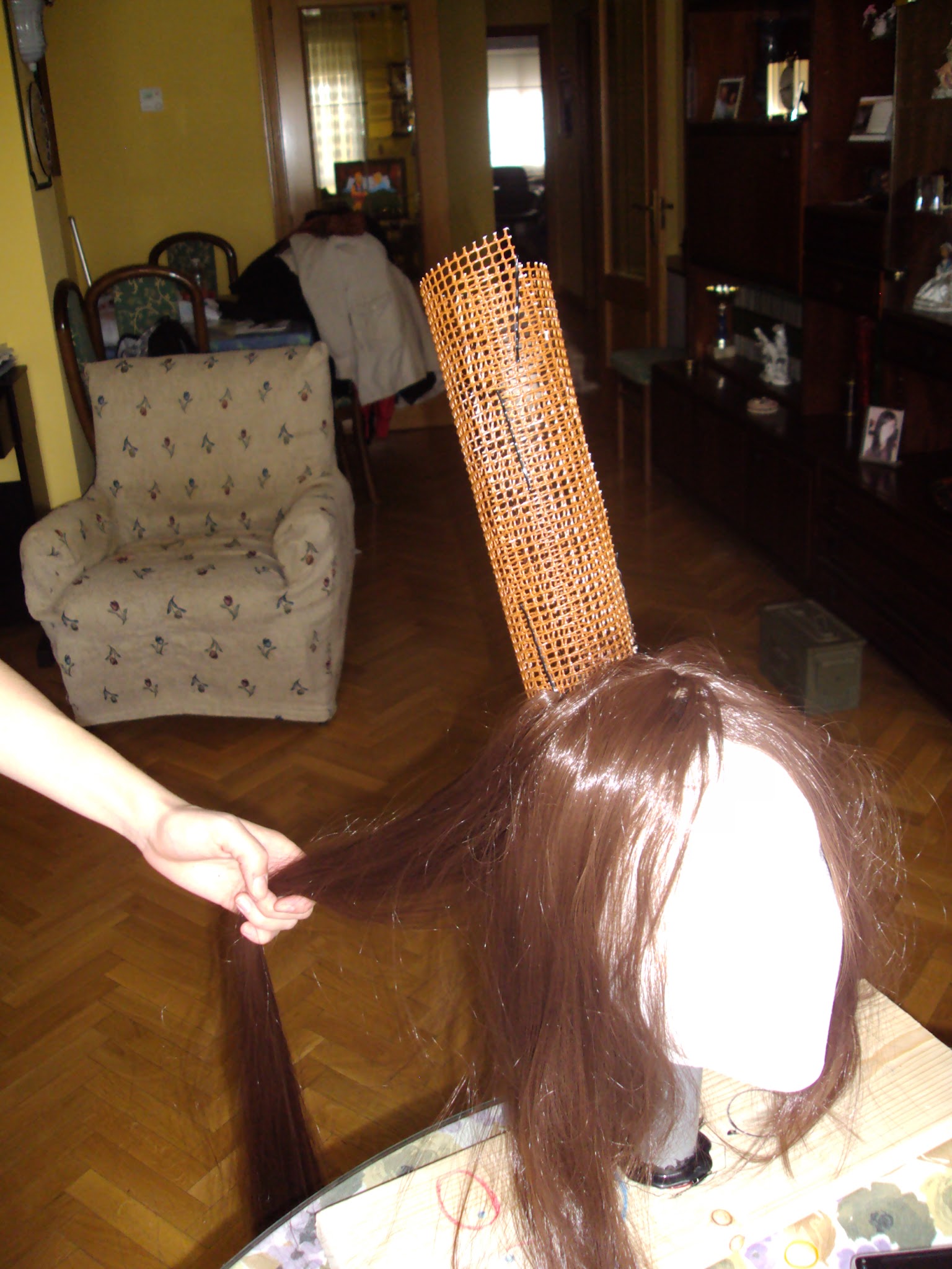 Lo primero que hice fue pintar con spray marr贸n una malla de jardiner铆a para utilizarla como estructura. Le di forma y la sujet茅 con horquillas. Esta t茅cnica es la que he utilizado siempre que he querido hacer una peluca con mo帽os grandes, la aprend铆 con la de Bayonetta, que me la hicieron y lo hice con la de Juri Han tambi茅n.