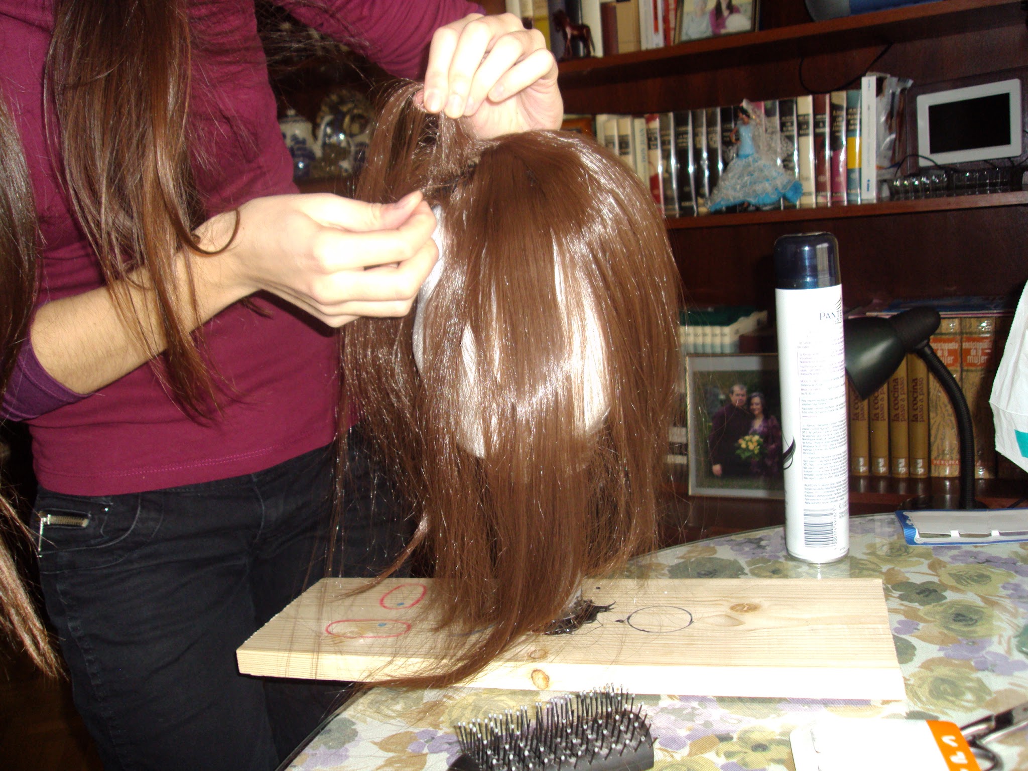 Cogimos la peluca larga, la pein茅 bien y le puse mucha laca para evitar enredos (mi mayor miedo).