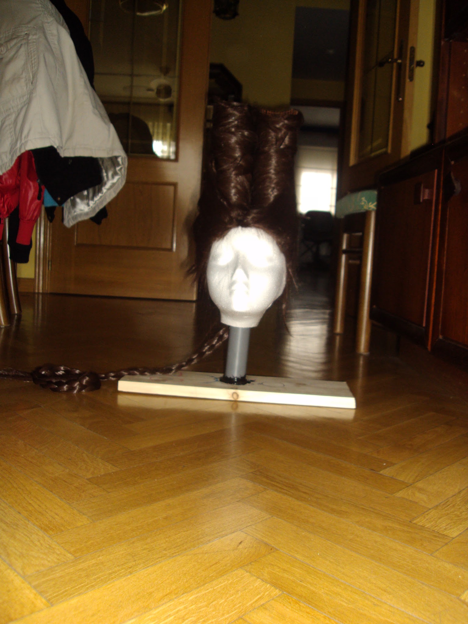 La puse sobre una cabeza de poliestireno que hab铆amos modificado previamente para que soporte mejor la peluca. Estas cabezas son muy ligeras y, como quer谩is peinar algo medianamente complicado sobre ellas, se caen continuamente. Adem谩s vienen con el cuello torcido, con lo que la referencia del centro se toma fatal.