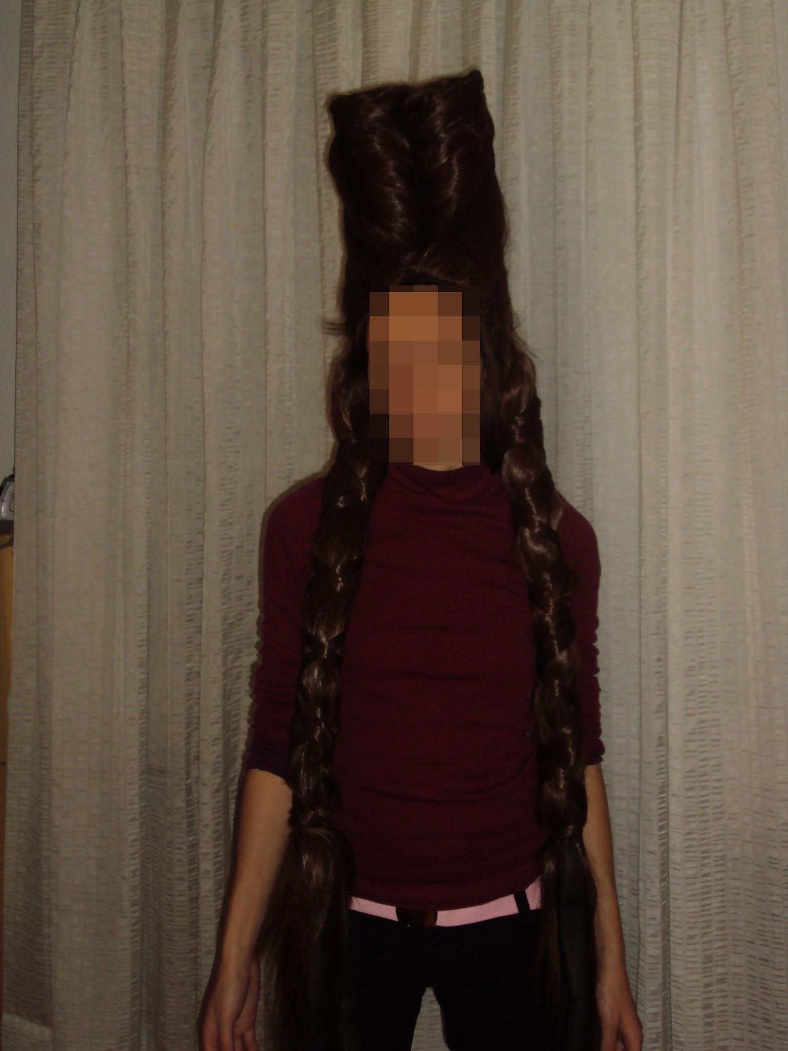 De esto tambi茅n se me olvid贸 sacar fotos porque est谩bamos agotad铆simos. B谩sicamente cog铆 cada trozo de peluca corta, lo un铆 con horquillas a los lados de la peluca principal y la enroll茅 a los tubos de caucho. Luego cog铆 los mechones que hab铆a dejado previamente en la parte baja de la peluca larga para enrollar varios mechones alrededor de las coletas y que dieran m谩s aspecto de trenza.