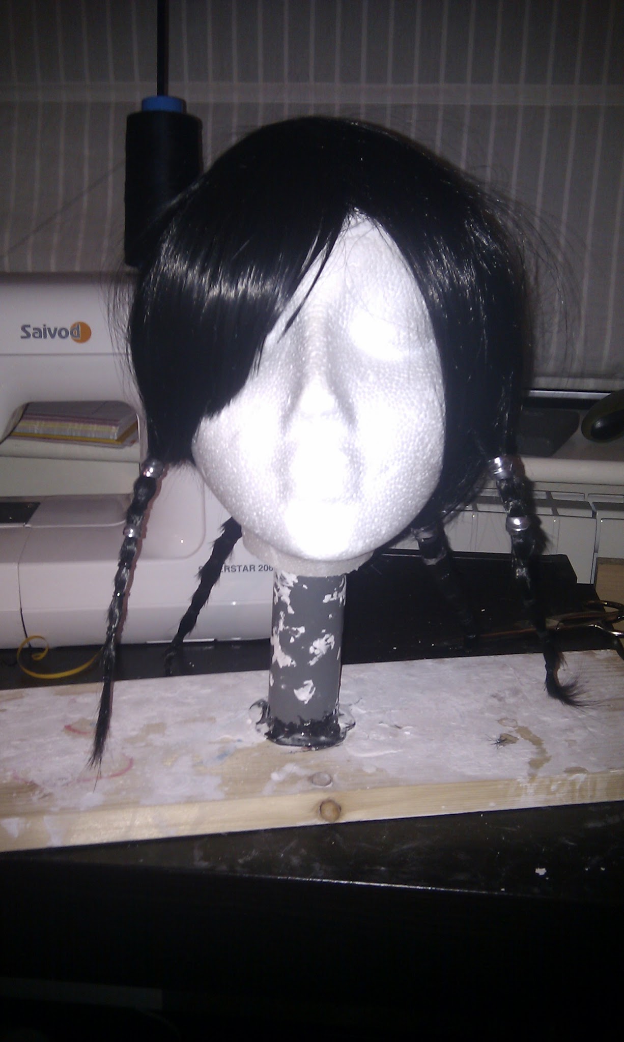 Fui recogiendo las coletas con gomitas negras finas de pl谩stico. Al principio me puse a hacer trenzas, que es lo que en realidad lleva el personaje; pero, como estaba cortada a capas, se me escapaban pelillos por todas partes, as铆 que fui poniendo gomitas a lo largo de las coletas para que diera un efecto (m谩s falso que Judas) de trenzado. En la parte superior de cada “trenza” hay dos adornos plateados que hice con cinta de plomo (de la de decorar vidrieras) enrollada. La verdad es que la cinta de plomo me ha sido de gran ayuda en varias ocasiones.