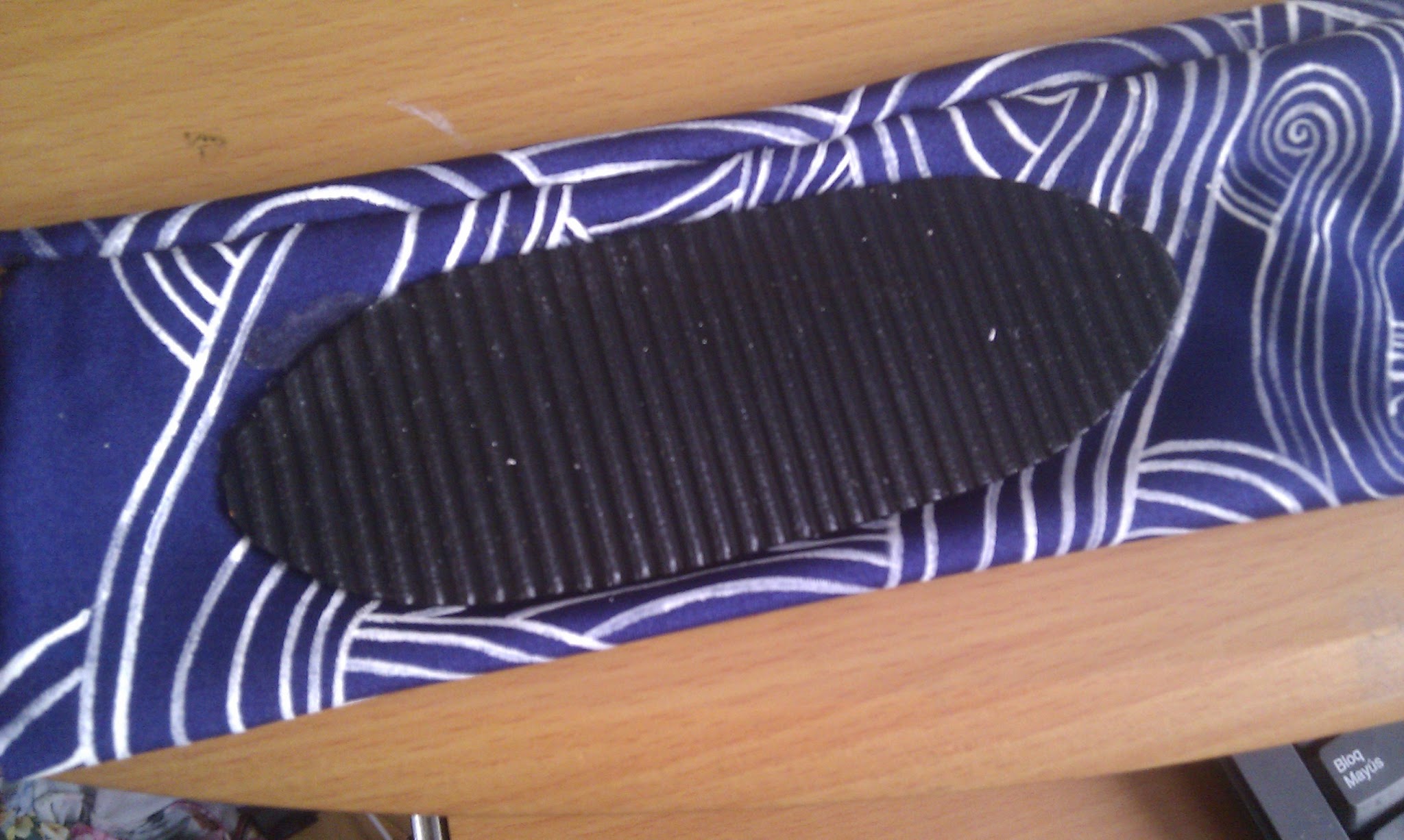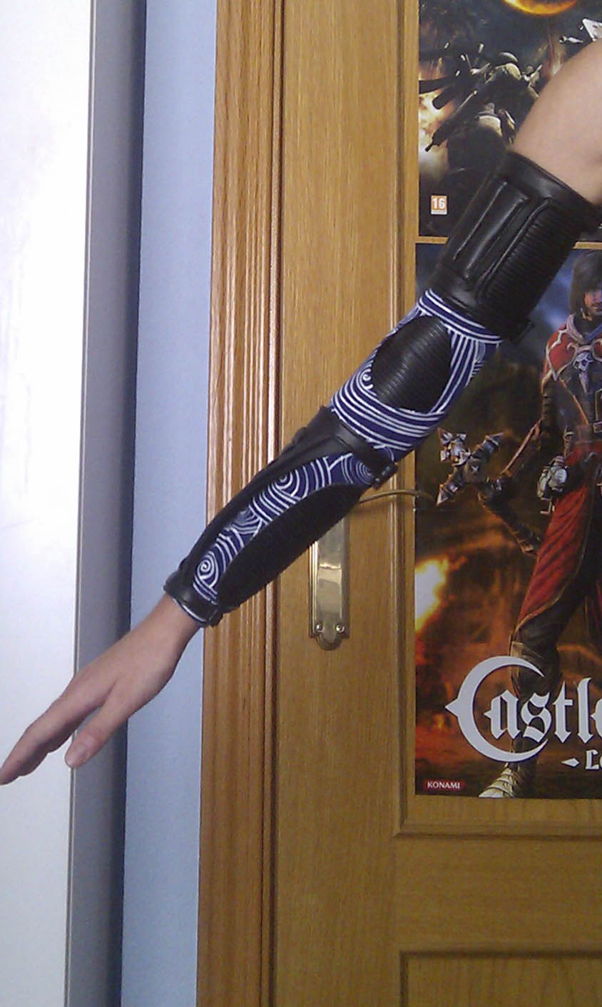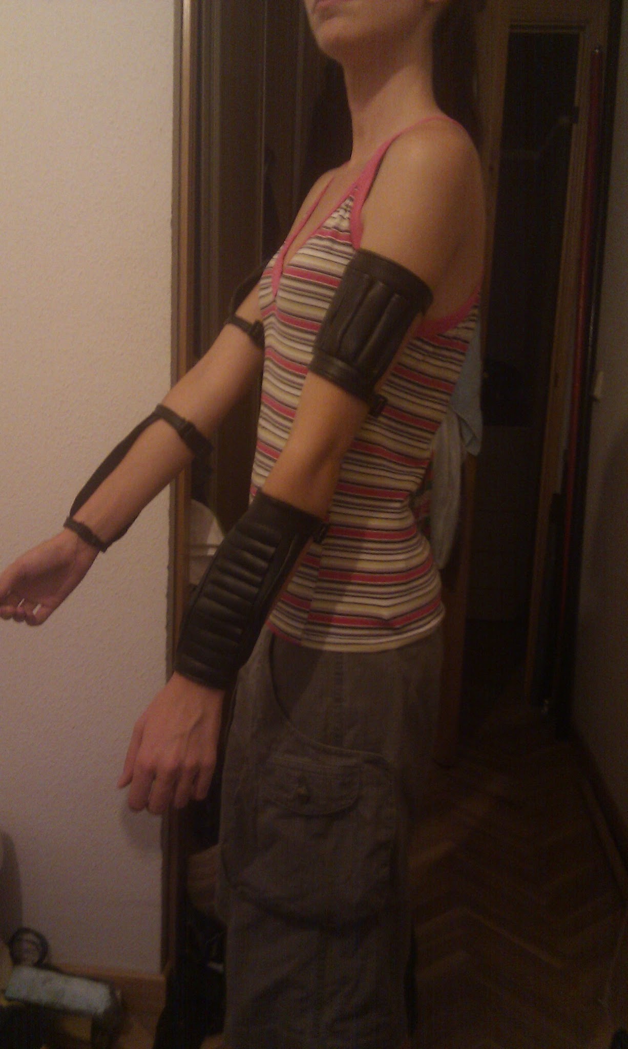 Para el dorso de los antebrazos y el interior de los codos utilic茅 goma eva de textura estriada (comprada en Chopo) pintada de negro. Queda muy bien, aunque tiene una pega y es que no la venden en colores oscuros. Con lo que la pintura, con el movimiento se desprende. En la zona del codo voy a acabar con un cacho naranja.